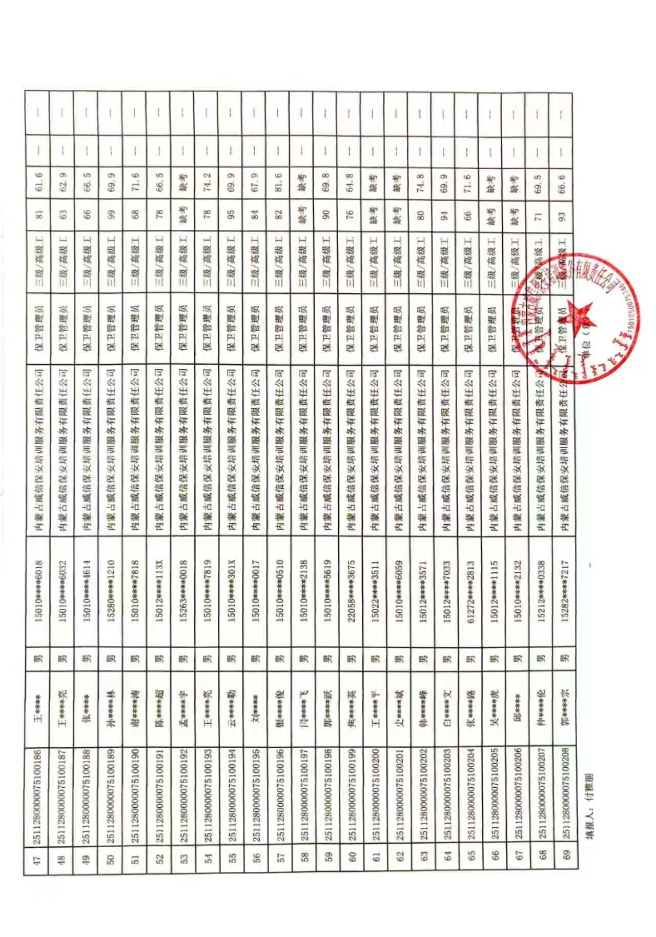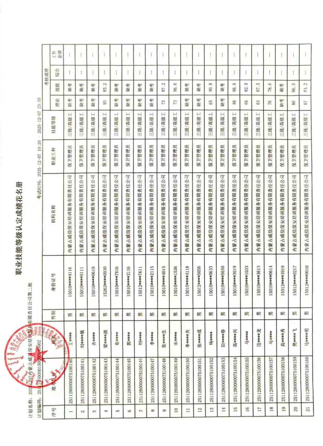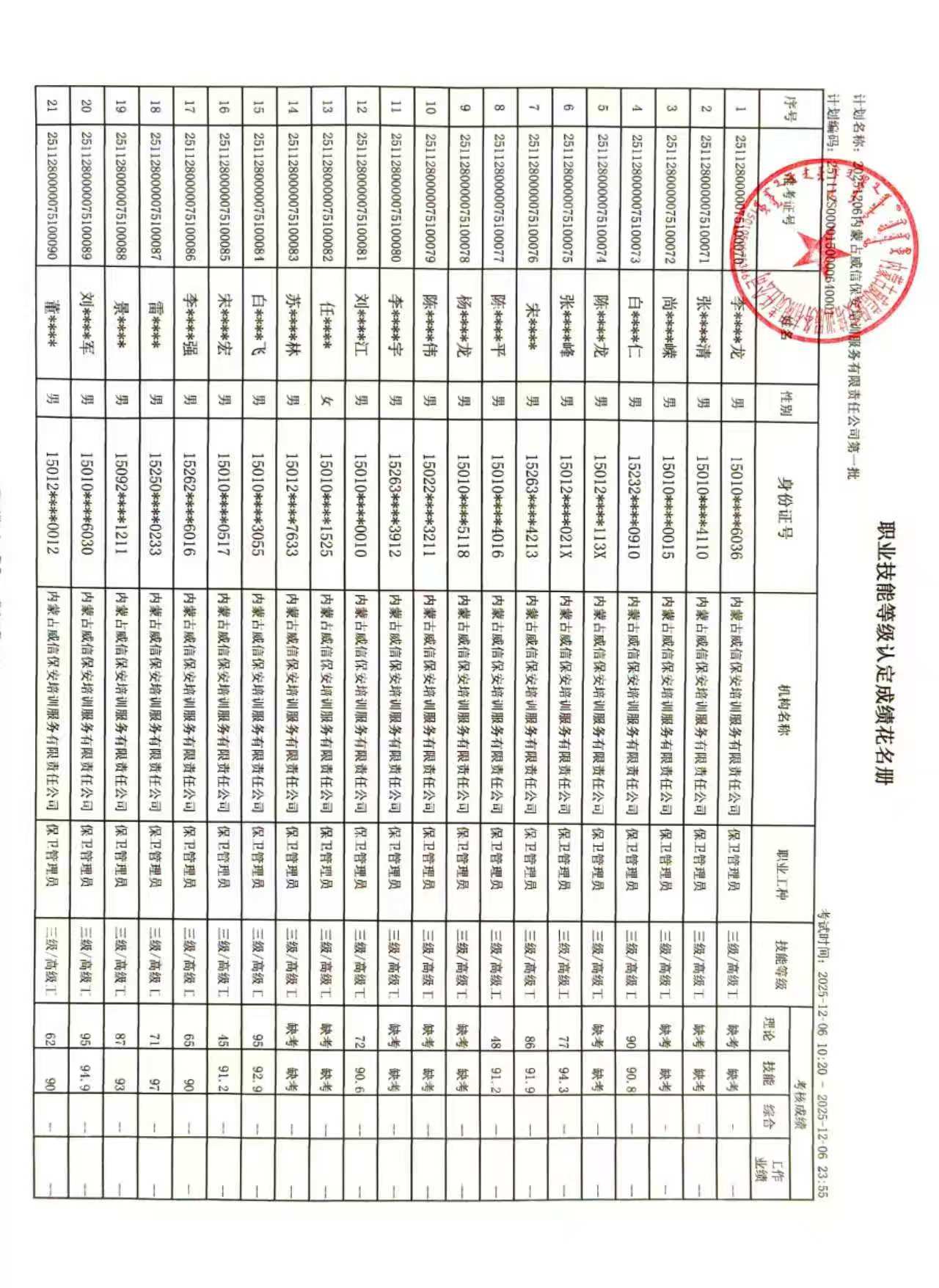 内蒙古威信保安培训服务有限责任公司2025年度12月6-7日保卫管理员职业技能等级认定成绩公示